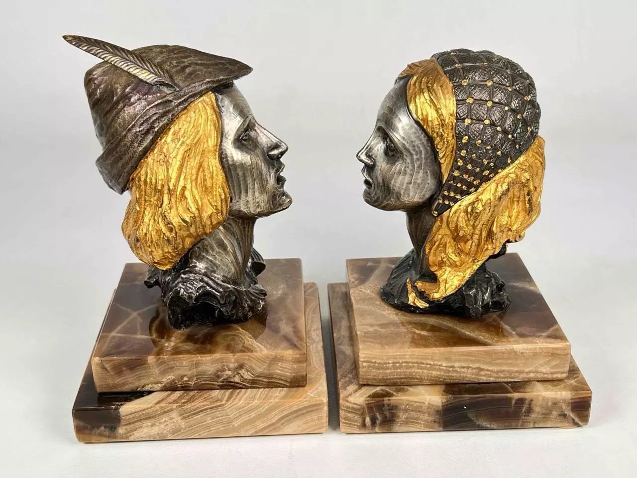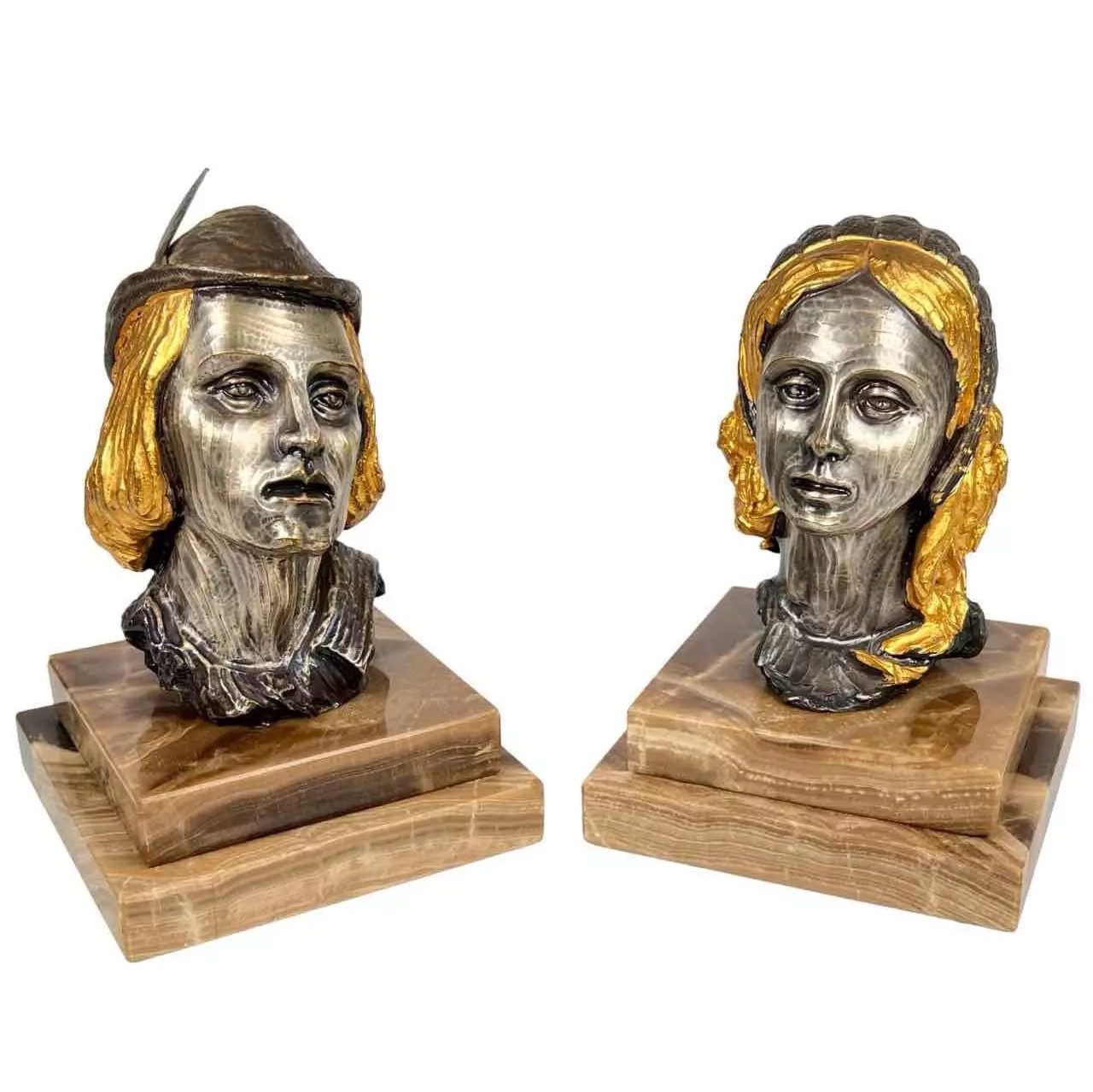 DESCRIPTION: This listing is for a beautiful pair of vintage busts by Italian artist Giuseppe Vasari! Crafted of silvered bronze atop stepped marbled onyx bases, these are star-crossed lovers Romeo and Juliet. Each bust is finely crafted and detailed, with highly articulated expressions and gilt overlay and accents on hair and head pieces.