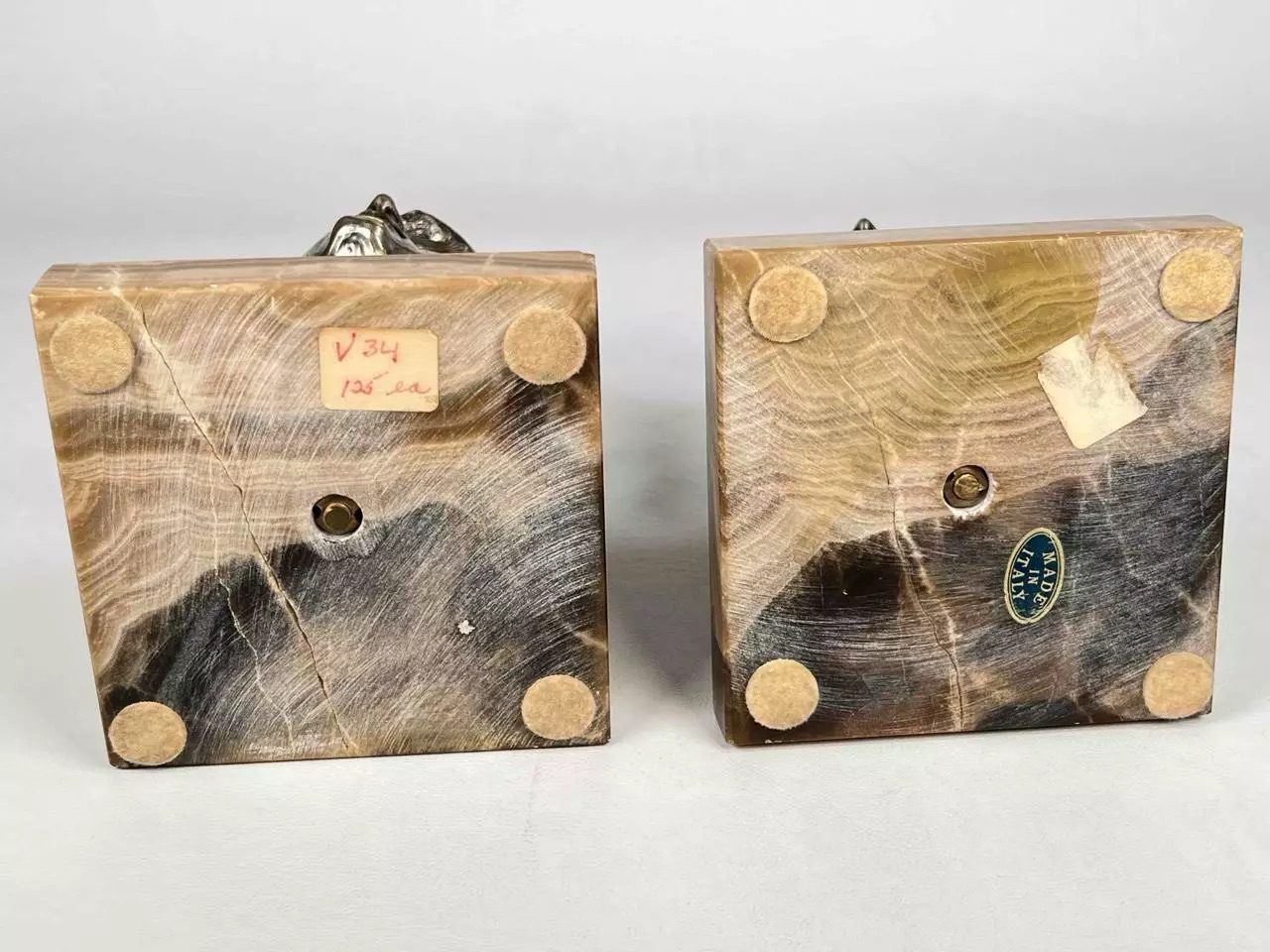 Juliet bust is signed on edge; Romeo is signed on back of vest. As is common when working with stone, there are fissures visible on the underside of each base. These are not visible when viewing the pieces and, given the way they have been professionally joined, are clearly from the creation of the piece.
