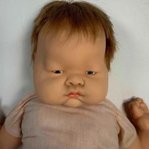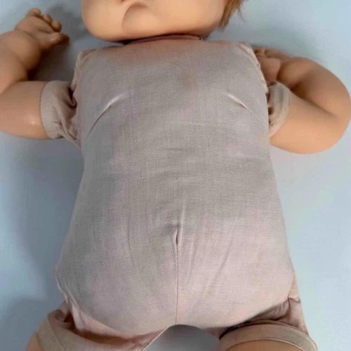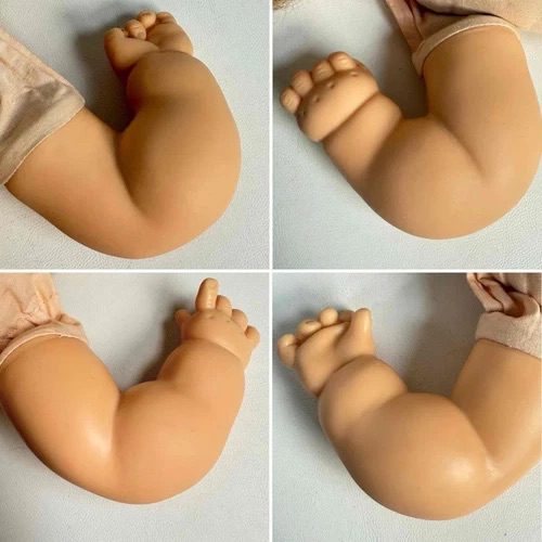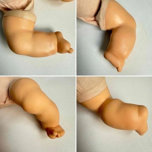 This sweet baby doll has painted blue eyes and a pink bow mouth. (We’re saying “she” but this is a truly gender neutral newborn baby doll and can be dressed however you’d like.) Her legs and arms are bent like a small baby’s would be, with toes curled and one open and one closed hand. She has a sweet expression and is wonderfully cuddly and chubby.