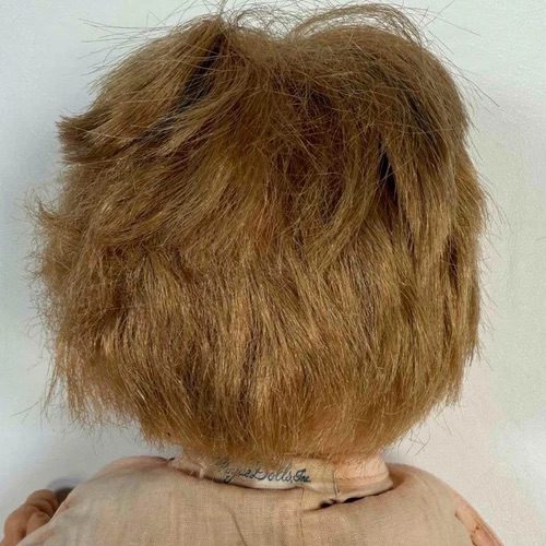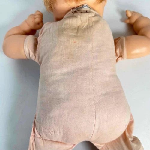 DESCRIPTION: Doll collectors, don’t miss your opportunity to own this beautiful “Baby Dear” doll by Vogue! Created in 1960 by Eloise Wilkins for the Vogue Doll company, this lovely doll is 17-18″ tall, with a soft cloth body and beautifully detailed vinyl head and limbs.