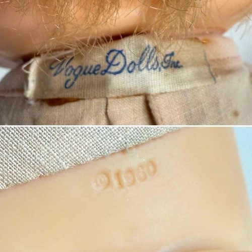The doll is marked with a “Vogue Dolls, Inc.” tag on the back of her neck on the body, and stamped “Eloise Wilkins 1960” on the back of the left leg, though the fabric of the body is stitched over the “Eloise Wilkins” and only the 1960 is visible.