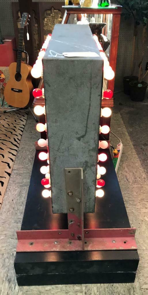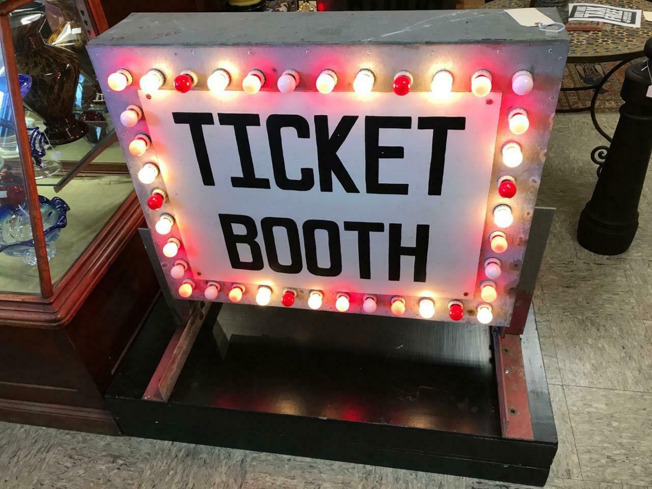 Today we are excited to present for sale a very rare and wonderful antique 1940’s Ticket Booth chasing light sign! This great sign is the epitome of 1940’s carnival era! The sign is nicely crafted of heavy formed metal with each side featuring a “Ticket Booth” sign with bold black letters on white ground. The sign on both sides is bordered by old-fashioned round light-bulbs in white and red (which can be changed to any color combination of your choosing) which light-up and go off in a “chasing” pattern to give the illusion of lights moving along the string and to visually attract attention to the sign. The piece was used to advertise the Ticket Booth in a carnival fair, boardwalk pier, or special event. The sign features mounting brackets on both sides and could be hung or used any creative way the buyer chooses. This piece would make a great behind the counter backdrop in a bar or coffee shop. Sign presents beautifully and is in very good vintage condition, with minor surface wear, oxidation and patina commensurate with age and use. In perfect working condition and complete with brand-new period-appropriate red and white light bulbs (replacements available on Amazon). This is a tremendous opportunity to acquire a rare and truly wonderful chasing light sign which will be THE conversation piece of any interior! Would also make a great photographer’s or a movie prop…The possibilities are endless. Fresh to the market!