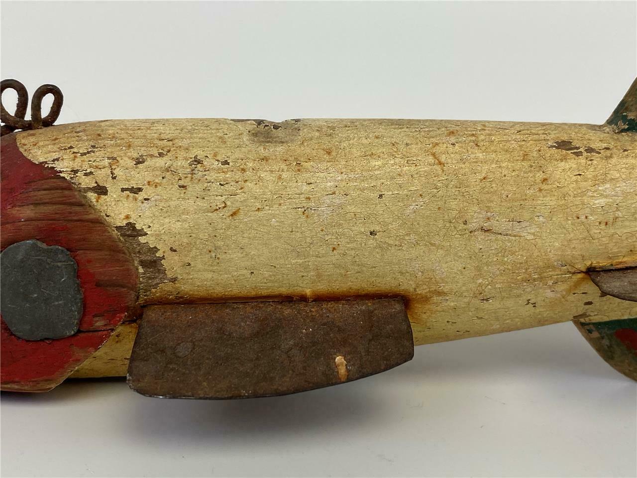 The piece has a great time-earned patina. Decoy is in good antique condition, with wear, oxidation and patina commensurate with age and type of use. There is surface scuffing and losses to painted finish. The tail of fish has deteriorated and is partially missing.