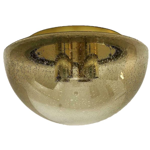 This fabulous and iconic Mid Century Modernist ceiling fixture dates to the 1960’s. The piece displays the high-quality of Limburg’s glass-making technique and skill. The fixture features a large and beautiful smoky quartz-colored clear bubble (aka: seedy) glass dome, which is mounted to a brass-plated metal ceiling pan. The pan features the original knobs that tighten it to the glass dome. The fixture features four US standard 60w light sockets. The fixture retains all of its’ original parts.