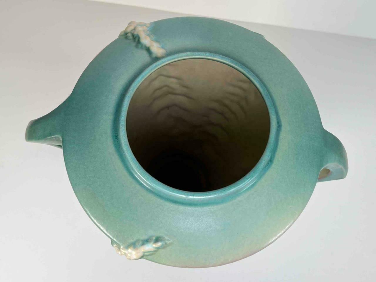 TITLE: Roseville Pottery Art Deco 1940s Foxglove Green Large Double Handled Vase 55-16″