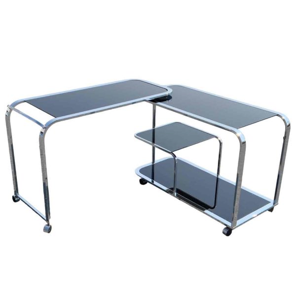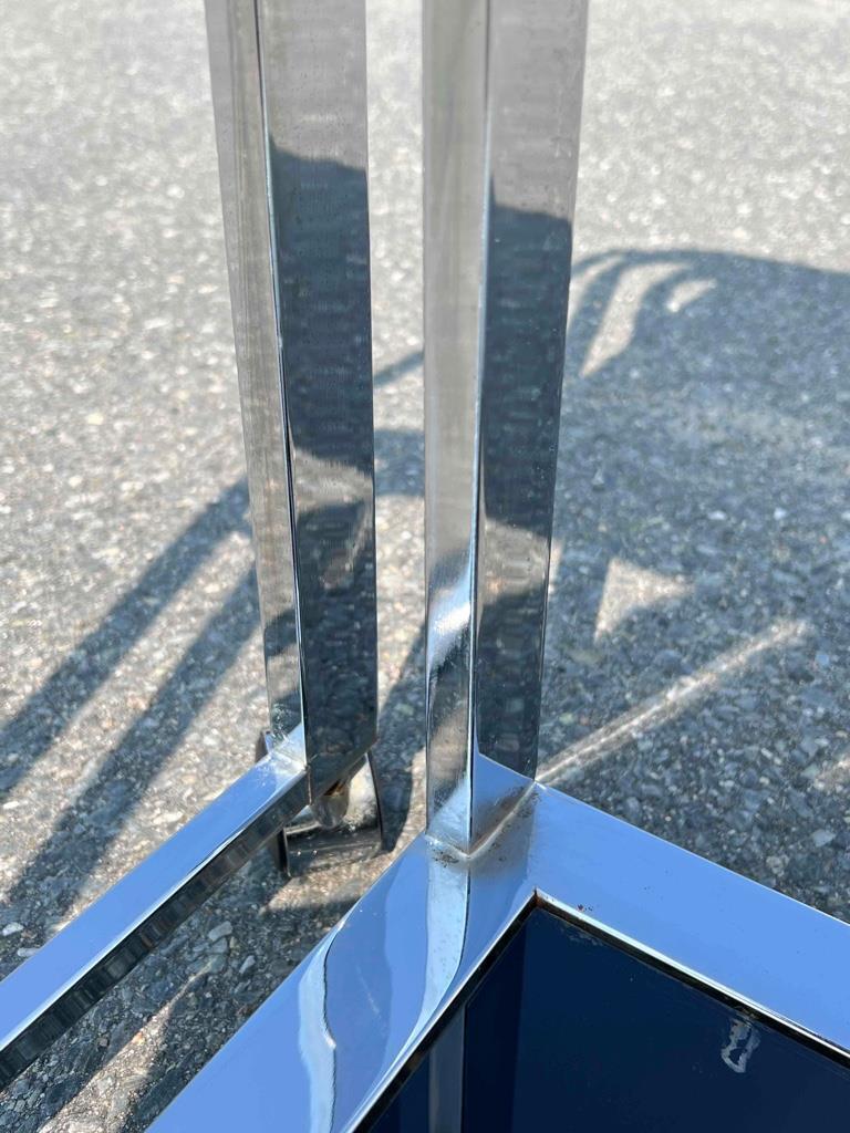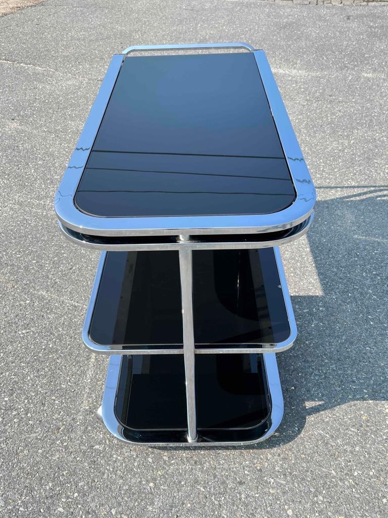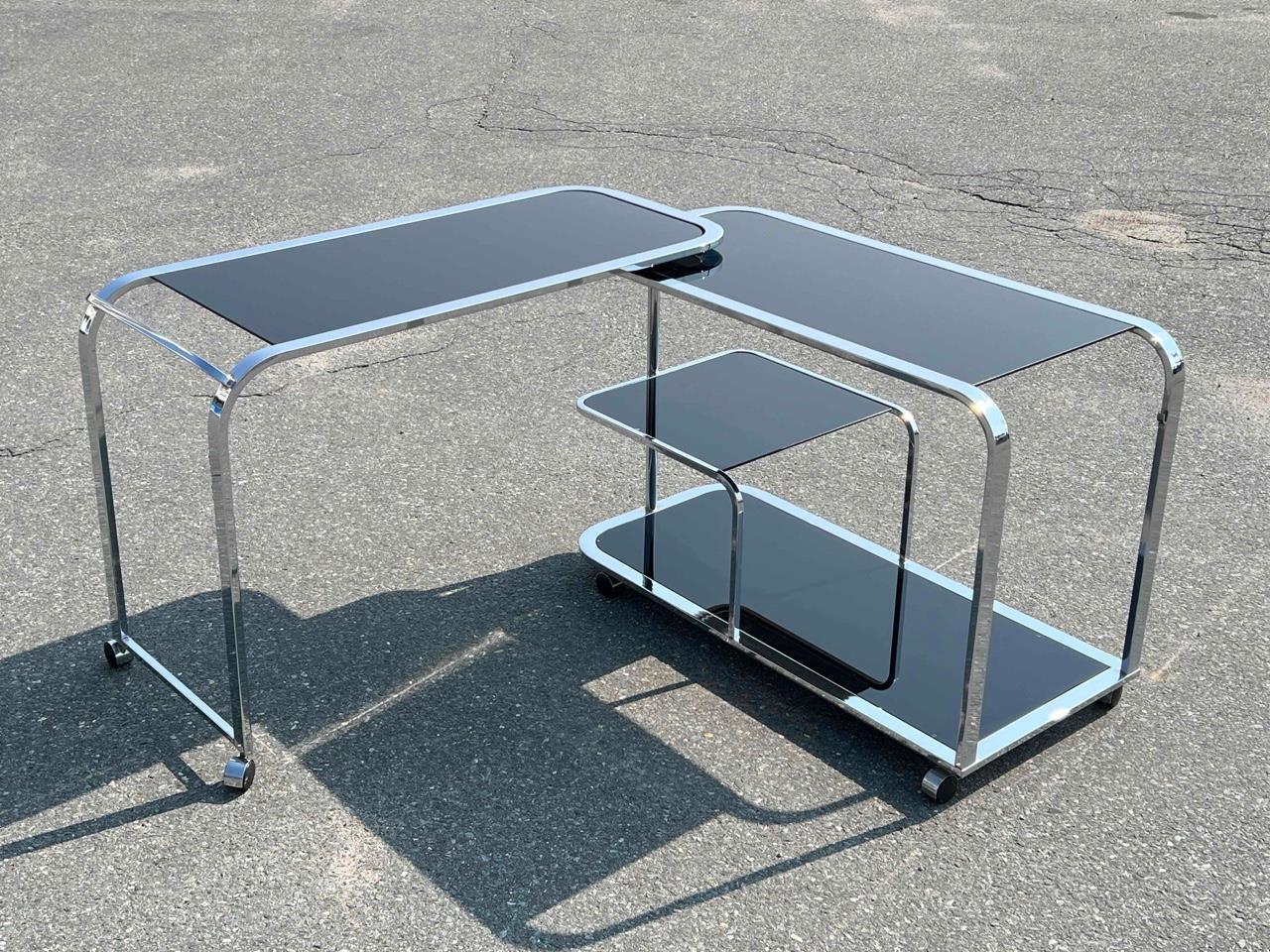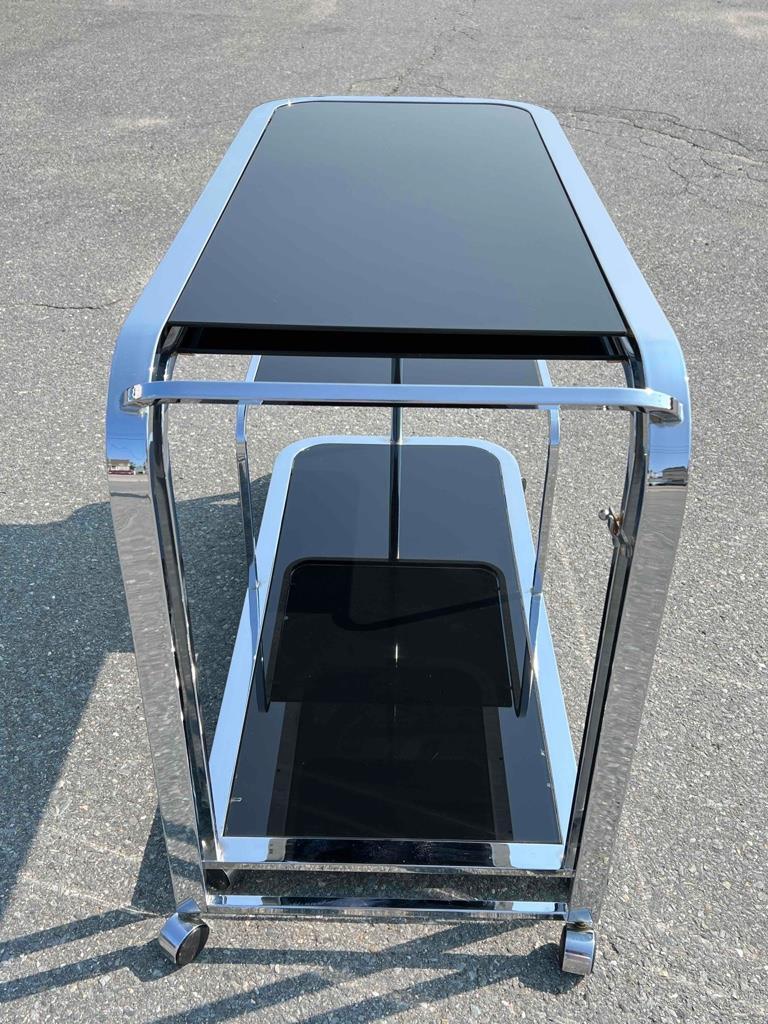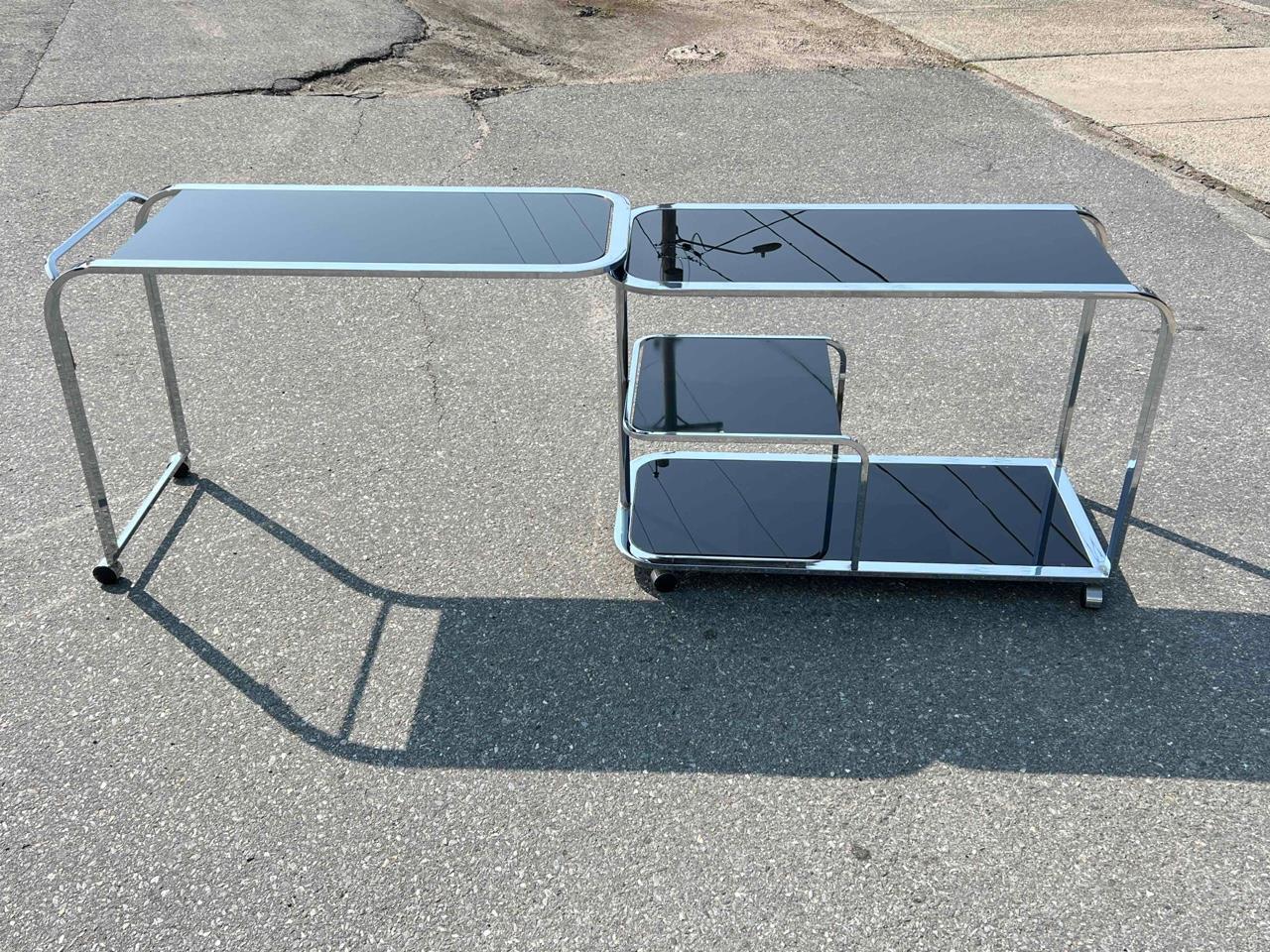 DESCRIPTION: This is a a wonderful vintage bar cart from the 1970’s, designed by renowned designer Milo Baughman for DIA – Design Institute of America, High Point NC. The sleek Mid Century Modernist design features a Chrome three-tier bar cart with a pivoting two shelf bottom section that swivels out on casters with black glass shelves. Besides functioning as a handsome trolley, this piece can be opened as a full bar to serve guests. Marked with DIA label. A very stylish addition to any interior!