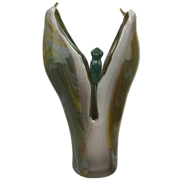 This vase features esteem designer Valentina’s hallmark high style and fine craftsmanship and artistry. The modernist piece is crafted of hand-blown multi-color molten Murano glass. The piece features a swirled combination of muted earth tones with highlights on ochre and pea green with touches of pale blue. The piece features two wing-like sides centered in the middle with an insect-body like glass applique.