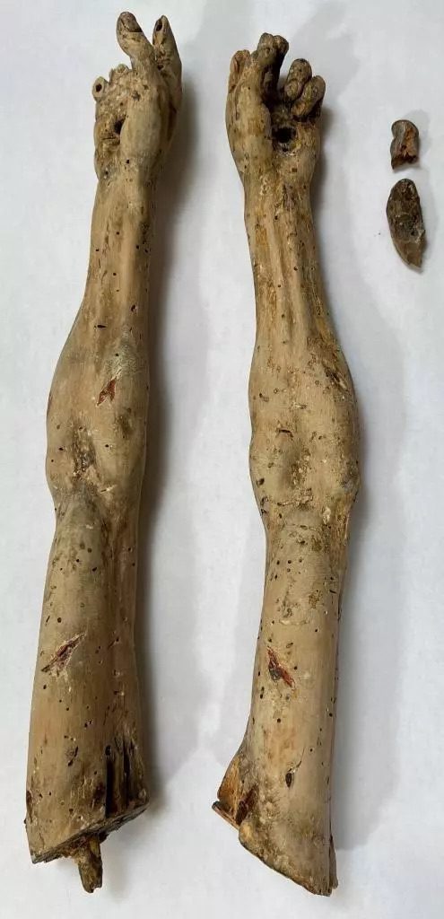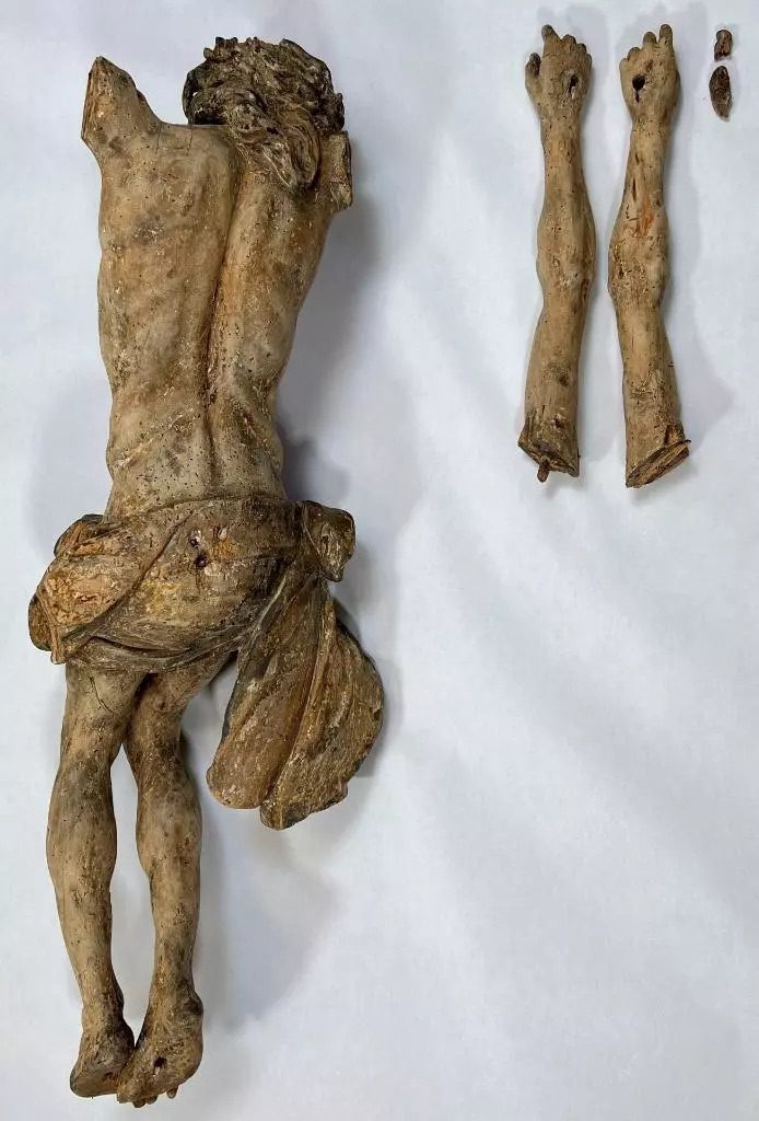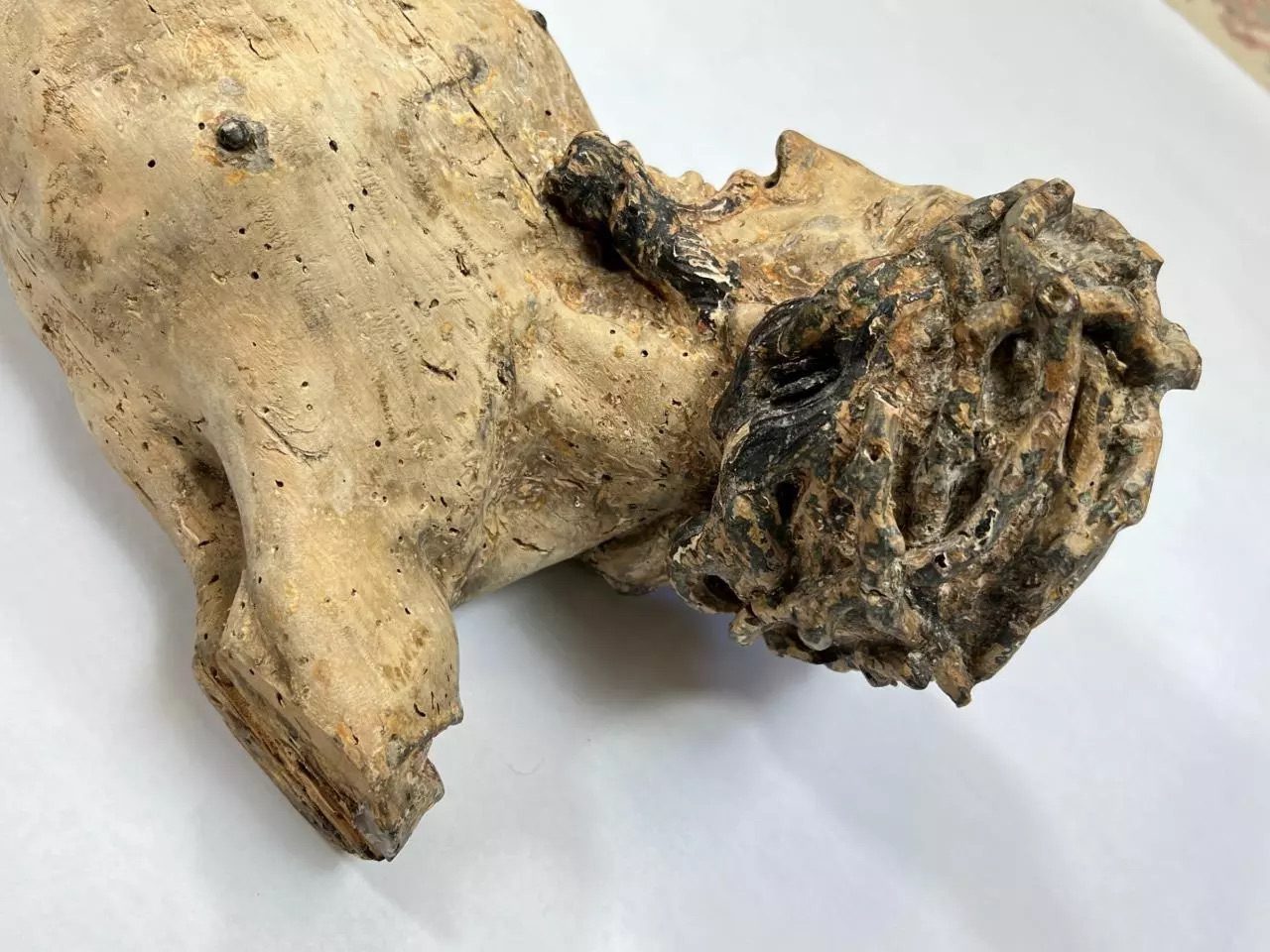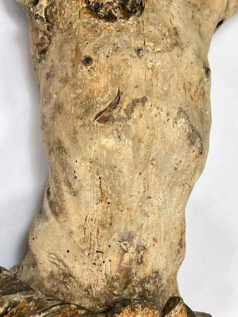 CONDITION: Statue is offered in as-found antique condition, with wear, damage and loss of restoration (last restoration dates to 19th century) present. Right hand is missing four fingers, left hand is missing one finger, left foot is missing all toes. Arms are detached from body, and some damage from (long gone) pests is present on the wood. This is a remarkable piece, especially given its age, but is in need of further work. Please review all photos before purchasing.