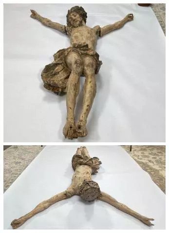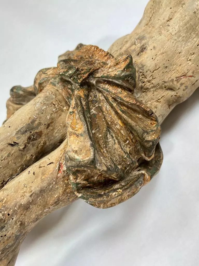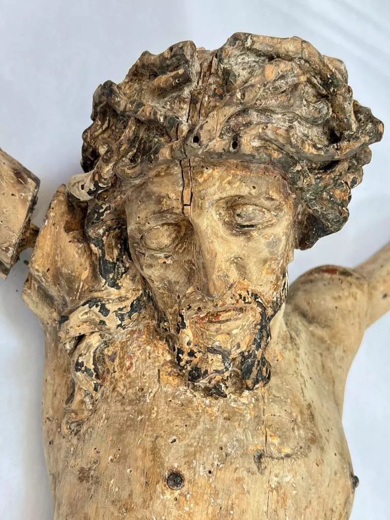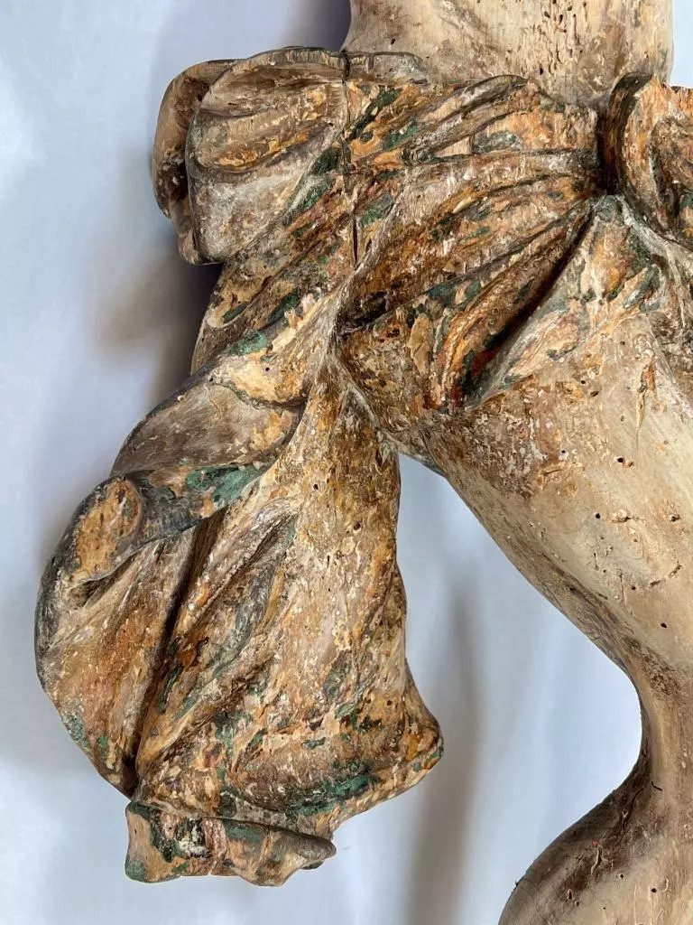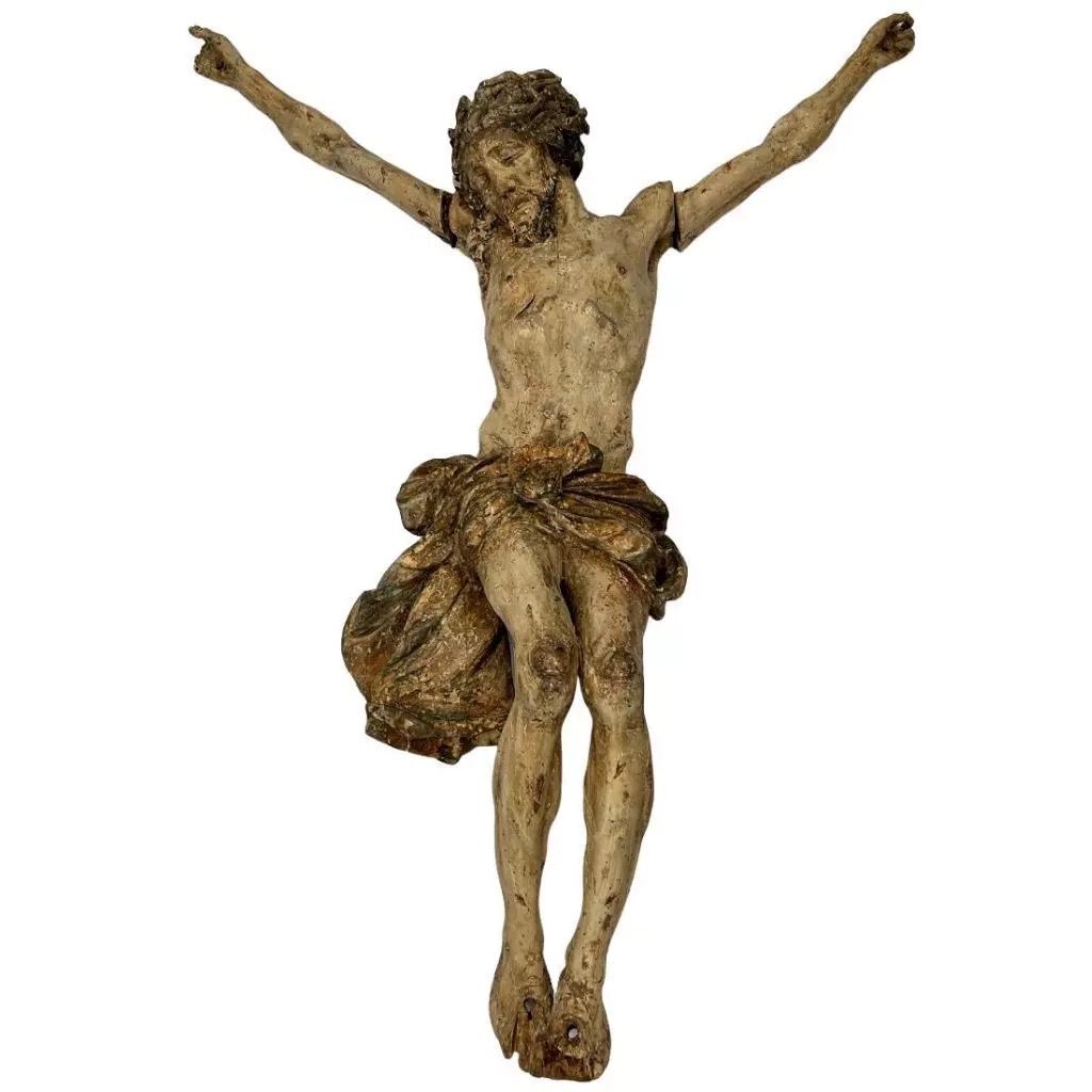 DESCRIPTION: Collectors of religious artifacts, take note! This beautiful carved wood Corpus Christi statue dates to the late 17th or early 18th century – a true antique! It comes from the collection of a world-renowned Austrian architect and designer.