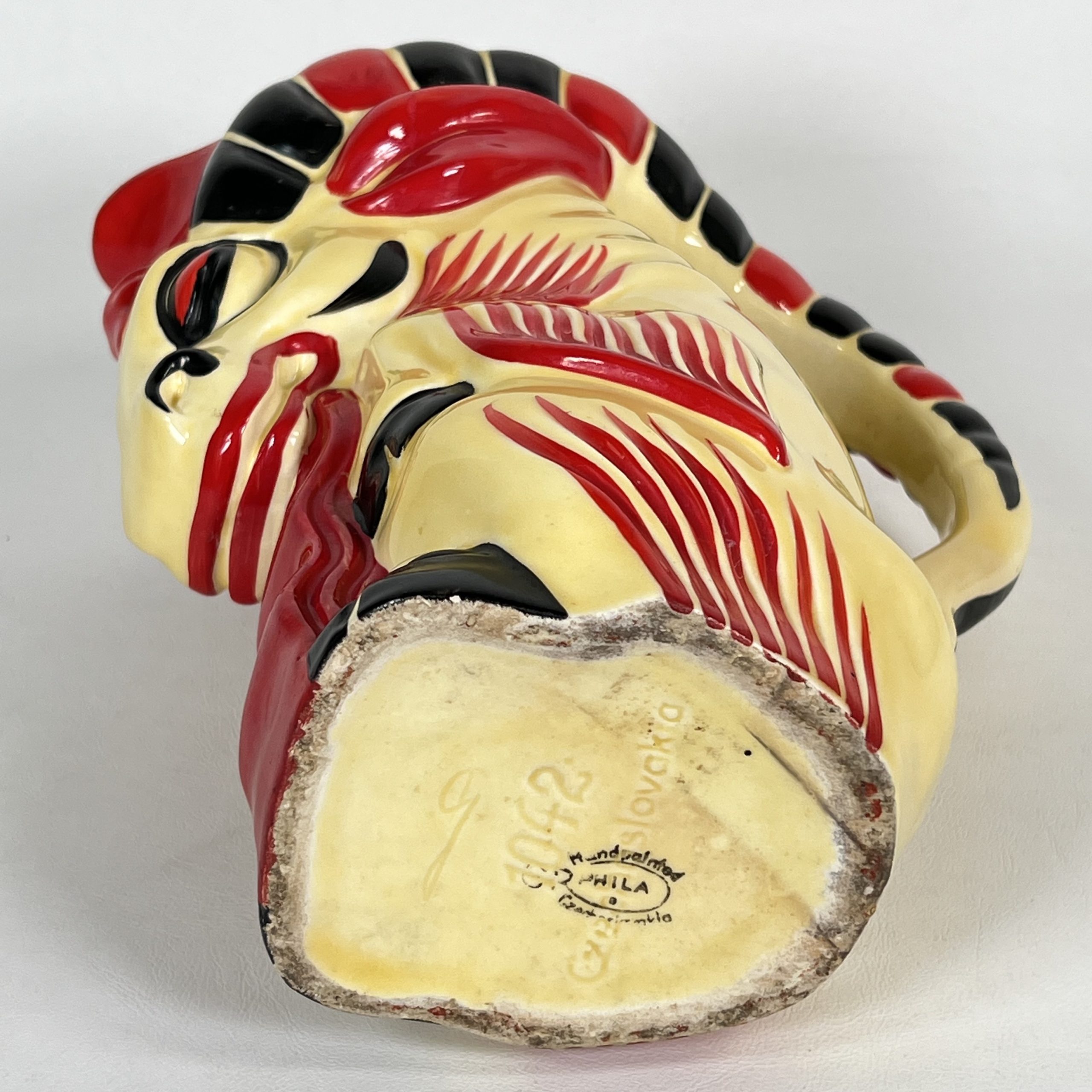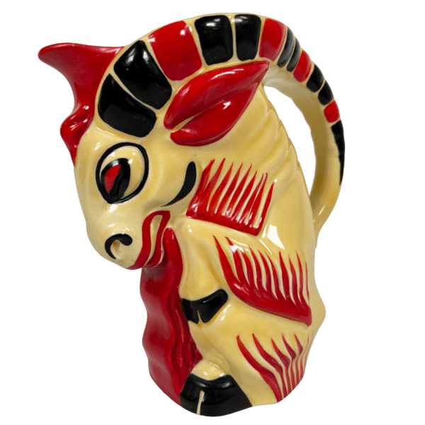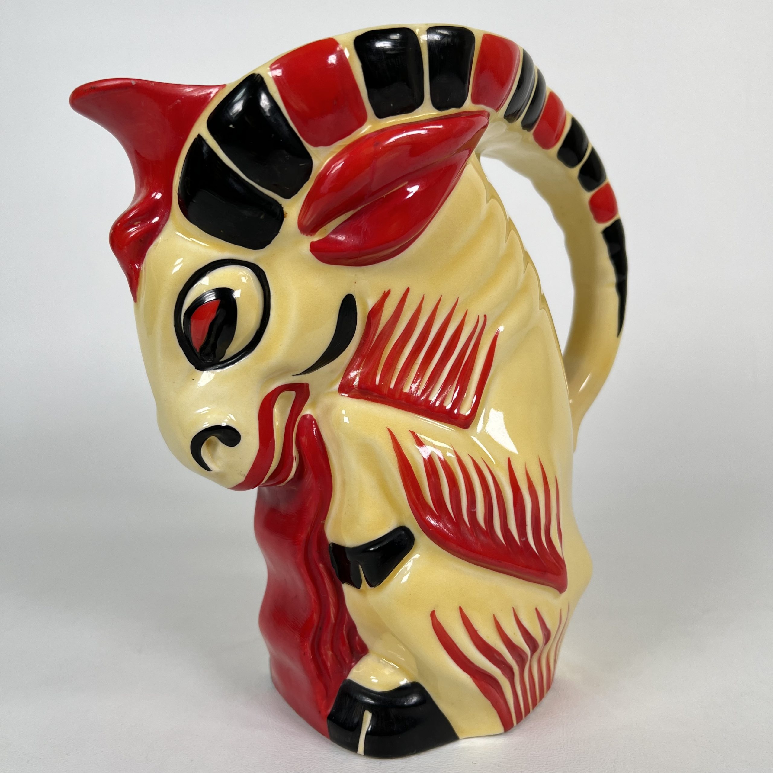 DESCRIPTION: This is a wonderful antique pitcher made by Czechoslovakian firm of Ditmar Urbach and retailed by Ebeling & Reuss of Philadelphia, a giftware firm that was founded in 1866. The piece, circa 1920s was made and hand painted in Czechoslovakia. The ceramic pitcher features the shape of a goat/ram with cream-color ground accented in vivid black and tomato red glaze. Signed ER Phila Czechoslovakia. A great addition to any collection!