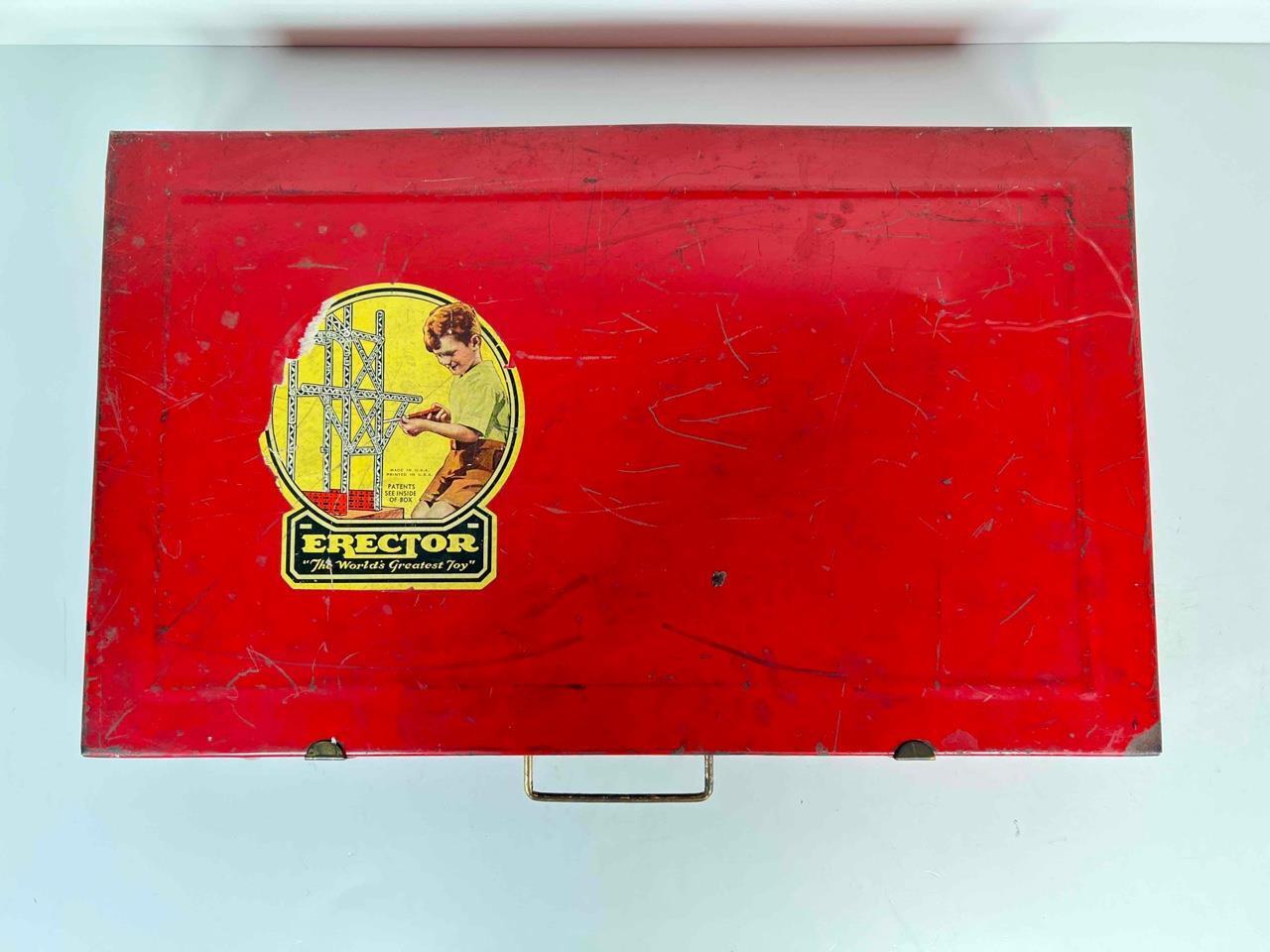 DESCRIPTION: Great antique Gilbert “The Great New Erector” set in original metal case, with two instruction booklets. We are not sure if all original parts are included but the case is quite full – what you see is what you get (some parts may be missing). Please review all photos before purchasing.